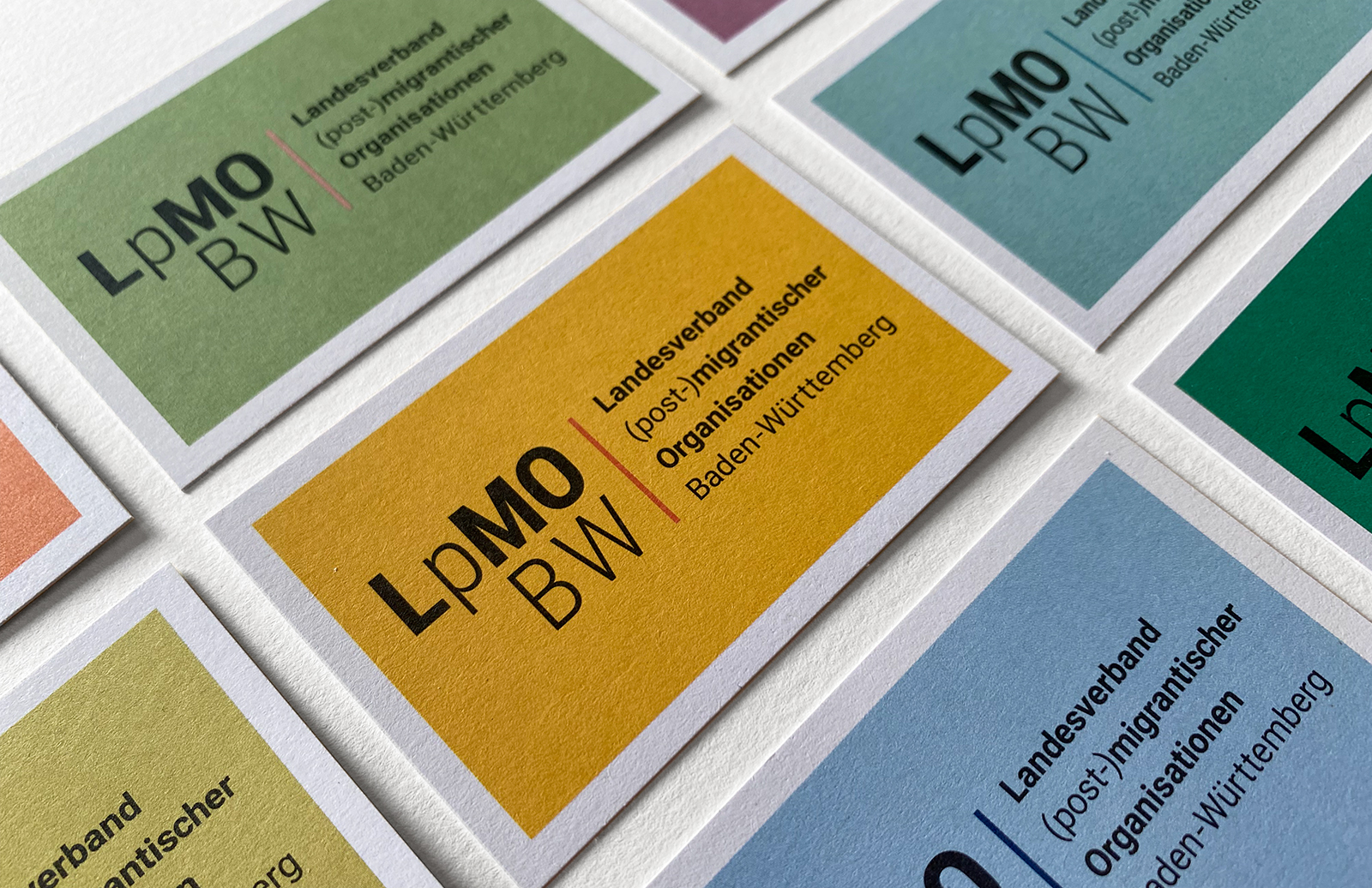 Für den 2023 neu gegründeten Landesverband (post-)migrantischer Organisationen Baden-Württemberg (LpMO BW) – bestehend aus 77 Migrantenvereinen – habe ich eine Corporate Identity geschaffen, damit migrantische und postmigrantische Organisationen eine starke Stimme erhalten. Ein visuell professioneller Auftritt ermöglicht eine vollwertige Teilhabe am gesellschaftlichen, politischen und kulturellen Leben. Kern der neuen Identität ist die Wortmarke inklusive eines zum interkulturellen Engagement passenden Farbkonzeptes. Darüber hinaus sind Visitenkarten, Briefpapier, Rollups, eine Webseite und vieles mehr entstanden.