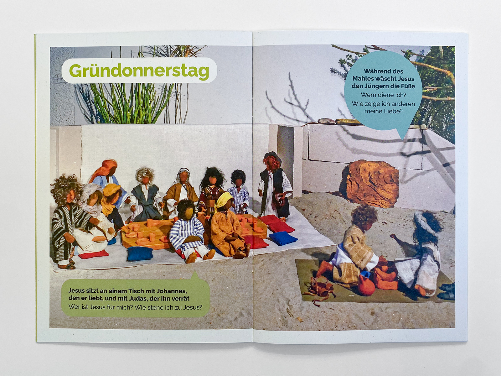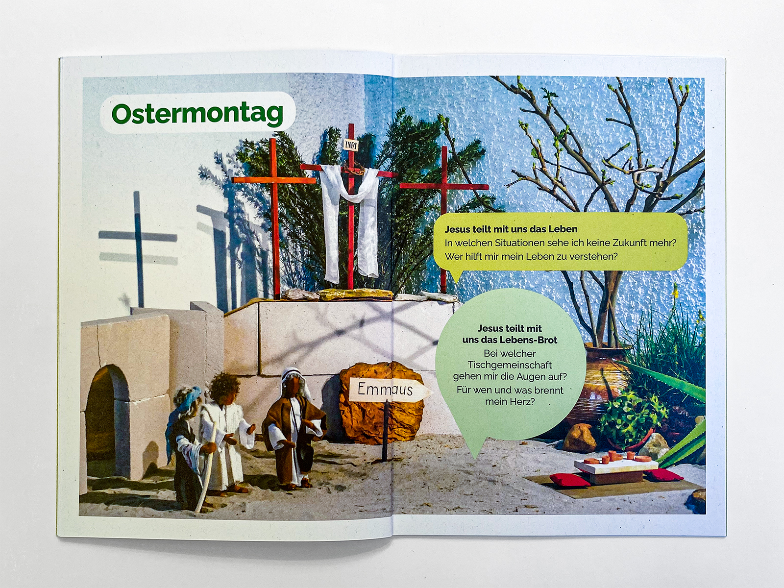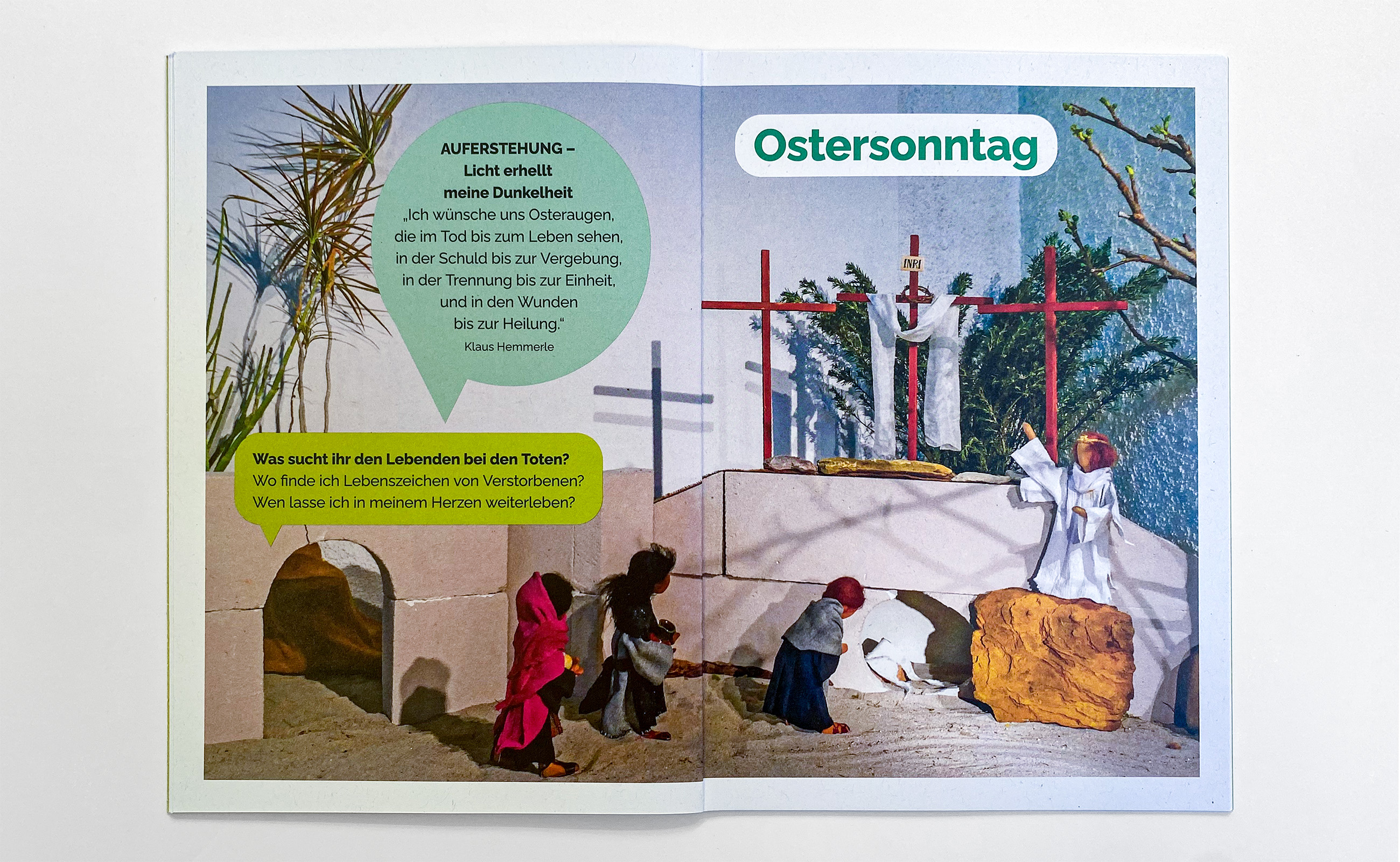 Die Texte stammen von Pfarrer Spitznagel und sind in Form von Fragestellungen verfasst. Die detailreich entworfenen Szenen und die liebevoll gestalteten Figuren von Elisabeth Reischl machen die Ostergeschichte erfahrbar. Die Fotografien von Robert Reischl fangen die Ereignisse rund um die Karwoche stimmungsvoll in Bildern ein. Es war mir eine Freude, das Buch zu gestalten.