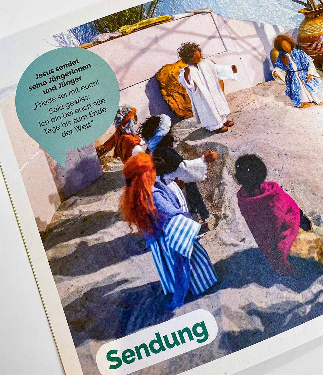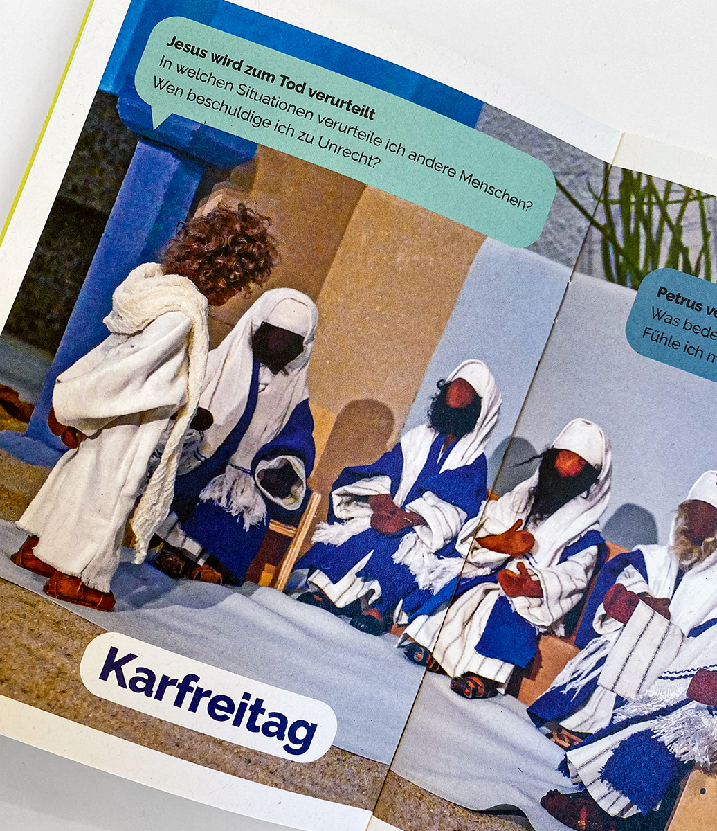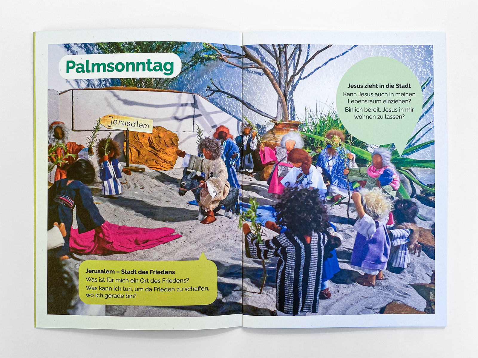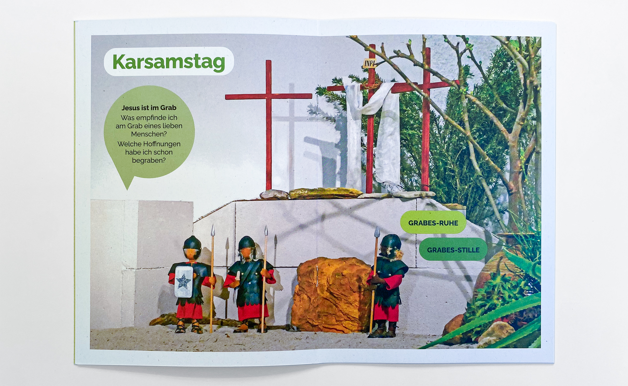 Die Texte stammen von Pfarrer Spitznagel und sind in Form von Fragestellungen verfasst. Die detailreich entworfenen Szenen und die liebevoll gestalteten Figuren von Elisabeth Reischl machen die Ostergeschichte erfahrbar. Die Fotografien von Robert Reischl fangen die Ereignisse rund um die Karwoche stimmungsvoll in Bildern ein. Es war mir eine Freude, das Buch zu gestalten.