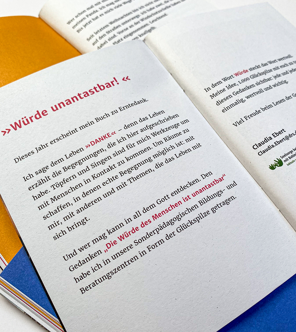 Ihr neuestes Buch mit dem Titel „Würde unantastbar“ ist zu Erntedank erschienen und erzählt authentisch und berührend von ihren alltäglichen Erlebnissen und allem, was das Leben so mit sich bringt. In 14 Geschichten macht sie die Herausforderungen und die kleinen Glücksmomente des Alltags sichtbar. Ihr gelingt dabei eine erstaunliche Gleichzeitigkeit von Leichtigkeit, Humor, Trauer und Würde. Gerade diese Vielschichtigkeit macht das Buch so lesenswert.